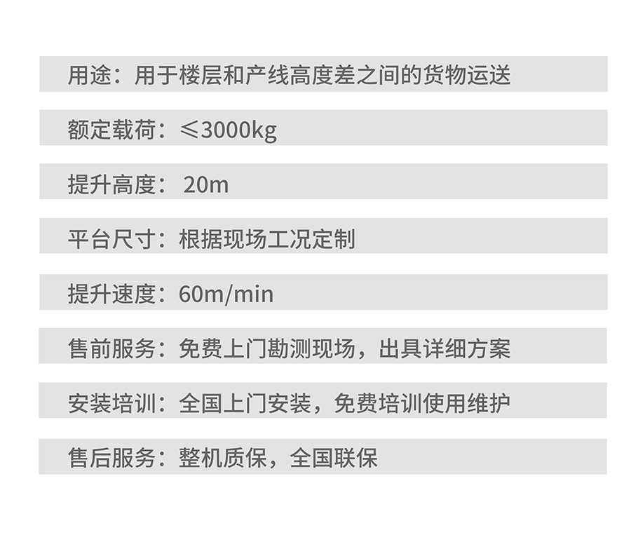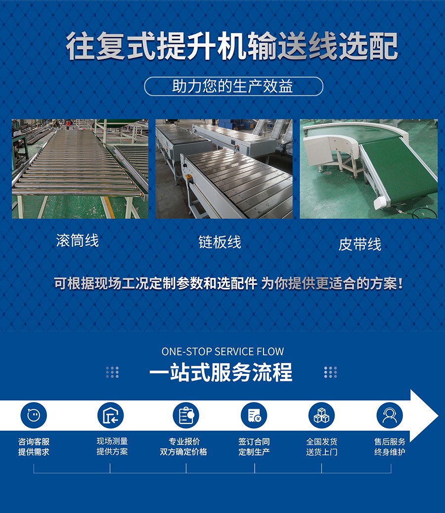 往復(fù)式提升機(jī)是由鏈條帶動,通過變頻調(diào)速控制電機(jī),便提升轎廂上下往復(fù)運動.提升轎廂上配有傳動機(jī)構(gòu),以便被輸送物自動進(jìn)入升降機(jī)的提升轎廂上。該類提升機(jī)具有控制先進(jìn),性能可靠,提升轎廂定位精度高等特點。
