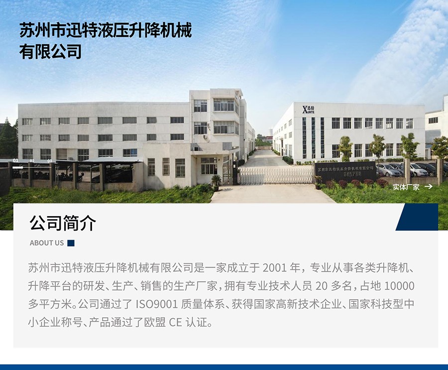 歡迎進(jìn)入蘇州市迅特液壓升降機(jī)械有限公司官網(wǎng),提供升降臺,升降平臺,液壓升降機(jī),移動式升降機(jī),電動升降機(jī),液壓升降平臺,登車橋等升降解決方案!
